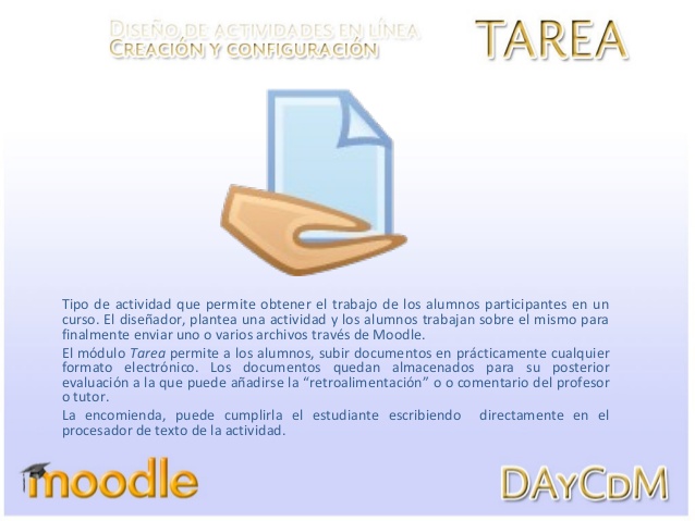 La actividad tipo tarea permite a los profesores la asignación de un trabajo u otro tipo de actividad a los alumnos y su posterior revisión, comentarios y evaluación.